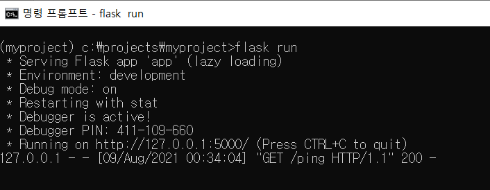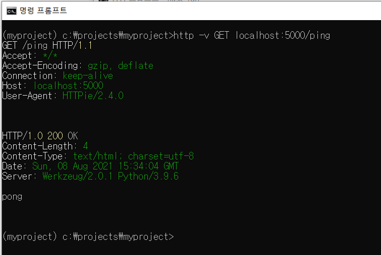 2. cmd창을 하나 더 열어서 가상환경에 진입해서(activate) http -v GET localhost:5000/ping 명령어 입력하기