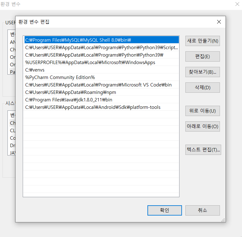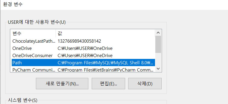 사용자변수 리스트에서 path를 선택하여 환경변수 편집 화면으로 이동한다.