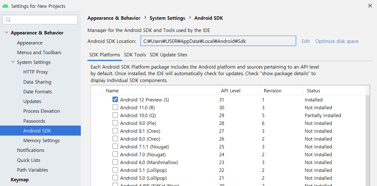 그다음은 안드로이드 스튜디오의 platform-tools를 설정해주어야한다.