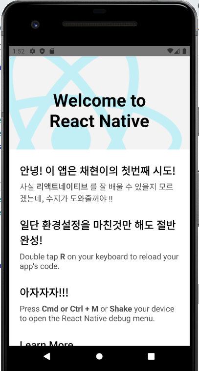리액트 네이티브를 사용하면 안드로이드 스튜디오에서 에뮬레이터를 계속 재실행 하지않아도 코드를 저장만하면 바로바로 적용이 된다! 너무 간단하고 편리하다. 속도가 빨라진다! Hot Reload 기능이라고 한단다.