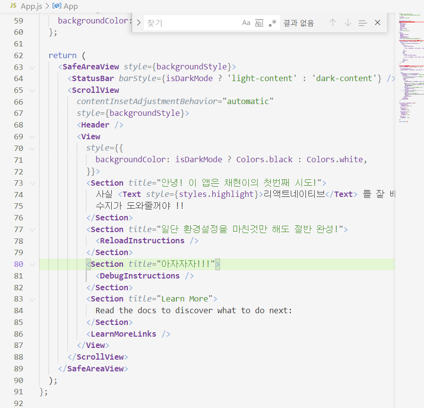 App.js를 열어서 텍스트들을 살짝 수정해보았다. 아래styles 부분에서 폰트크기 등도 변환할 수 있다.