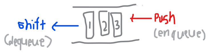 마찬가지로 push()는 삽입, shift()는 가장 앞의 것 삭제 함수이다.